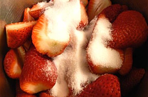 Ripe Strawberries in Granulated Sugar Ready to MashOver all, sprinkle a few chopped nutmeats and a little rich fresh strawberry dressing made by mashing the strawberries in granulated sugar.
