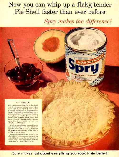 Spry Shortening Pie Shell Recipe, circa 1950sCommercial shortening companies often featured old fashioned pie crust recipes in magazines to encourage the use of their product. Below is a vintage example from Spry Shortening.