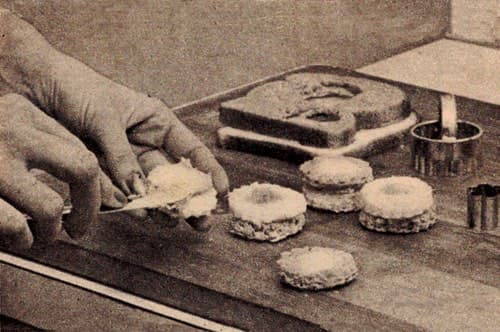 Cream one-half cupful of butter, using a wooden spoon, add one cupful each of finely chopped cold boiled ham and cold boiled chicken; season to taste with salt and pepper and spread the mixture between slices of buttered bread. —Ryzon Baking Book
