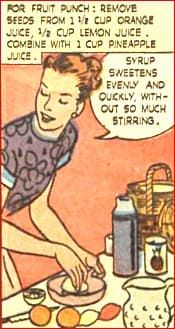 For fruit punch: Remove seeds from 1-1/2 cups orange juice, 1/2 cup lemon juice. Combine with 1 cup pineapple juice. Add 2 cups ice-water, syrup to sweeten. Add chopped ice. Pour into thermos or sealed, insulated container to keep chilled.